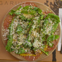 Carpaccio de carne bovina temperada com molho de mostarda trufada, parmesão, quinoa crocante, raspa de limão siciliano e rúcula. Acompanha cesta de pão de fermentação natural.