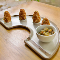 Croquete de pernil suíno temperado com limão siciliano, crocante por fora, cremoso por dentro, regado de molho asiatico e acompanhado de aioli de bacon glaceado.