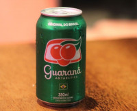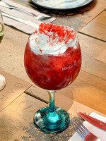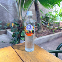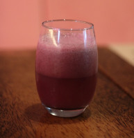 Suco de laranja, suco de limão, água com gás e xarope de morango.