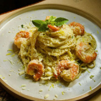 Espaguete grano duro com camarões envoltos em molho leve de creme de leite fresco, vinho branco, alho e limão siciliano, finalizado com raspas de limão siciliano e parmesão ralado.