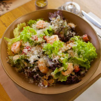 Mix de folhas, camarões grelhados, amêndoas laminadas, morangos frescos, quinoa crocante, gergelim tostado e molho de mostarda, mel e aceto balsâmico.