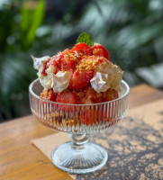 Mousse de baunilha importada com gel de morango, morangos frescos, farofa de chocolate branco, mini suspiros e raspa de limão siciliano.