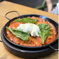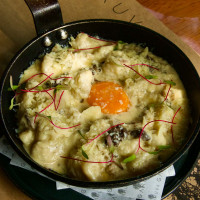 Nhoque de batata feito na casa, com molho a base de creme de leite fresco com cogumelo shimeji, shitaki e parmesão. Finalizado com gema de ovo caipira e salsa tartufada.