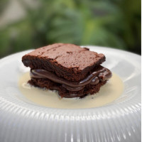 Bolinho super macio de chocolate, mousse de chocolate, creme anglaise de laranja e mix de nuts caramelizados.