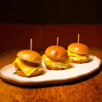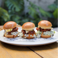 3 Mini sanduíches de sobrecoxa desossada empanada na farinha de flocos de milho, com molho cítrico de laranja, mel e pimenta, com saladinha de alface e picles de abacaxi.