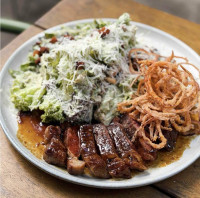 Baby beef de 300g perfeitamente finalizado em chama aberta acompanhado de salada de mix de folhas com molho Caesar, croutons, amêndoas crocantes e parmesão ralado.