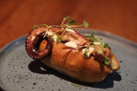 Mini brioche feito na casa recheado com polvo salteado no mel de engenho e vinagrete de amora, finalizado com aioli de alho.