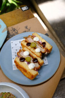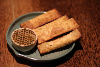 4 unidades de pastel recheado de creme de queijo de cabra, acompanhado de mel de alecrim.