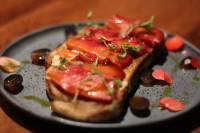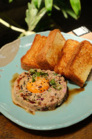 Tartar de atum temperado com molho de páprica defumada, finalizado com gema de ovo caipira, azeite trufado e sal maldon. Acompanhado de pão brioche tostado.