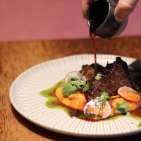 Cupim perfeitamente cozido servido desmanchando regado ao molho ponzu, acompanhado de purê de abóbora, farofa de pão crocante e coentro fresco.