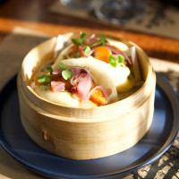 Tradicional pão chines feito no vapor, recheado com frango crocante, aioli de coentro, bacon glaceado e picles de cenoura e cebola roxa.