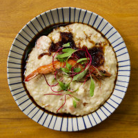 Risoto de arroz arbóreo bem cremoso com camarões e queijo prima Donna, finalizado com cebola reduzida e caramelizada no molho shoyo.
