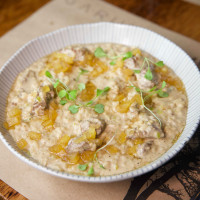 Risoto feito com arroz arbóreo italiano, queijo gorgonzola, finalizado com cubos de pêra caramelizada.