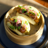 Tradicional pão chines feito no vapor, recheado com dourado empanado e crocante, molho tártaro, picles de cebola roxa e um toque de molho asiático.
