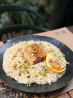 Filé de dourado grelhado com risoto de parmesão finalizado com pistache caramelizado, mel trufado e limão siciliano tostado.
