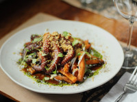 Polvo grelhado servido com batatas rústicas salteadas e molho poivre de pimenta verde fresca.