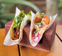 Dupla de tacos, um de cupim coalhada seca e coentro, e outro de camarões empanados, repolho fresco e alioli de páprica picante.