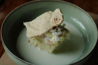 Bolo super macio e molhadinho de coco, com ganache de coco, calda de coco e telha de suspiro crocante.