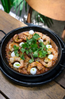 Clássica paella espanhola feita com camarões,polvo e bacon, com fundo levemente tostado, finalizado com aioli de alho e coentro fresco.