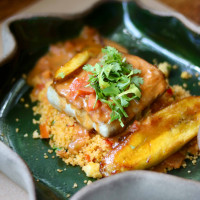 Dourado grelhado acompanhado de couscous marroquino bem temperado, molho de moqueca feito com leite de coco light e banana caramelizada no mel de engenho, finalizado com coentro fresco.